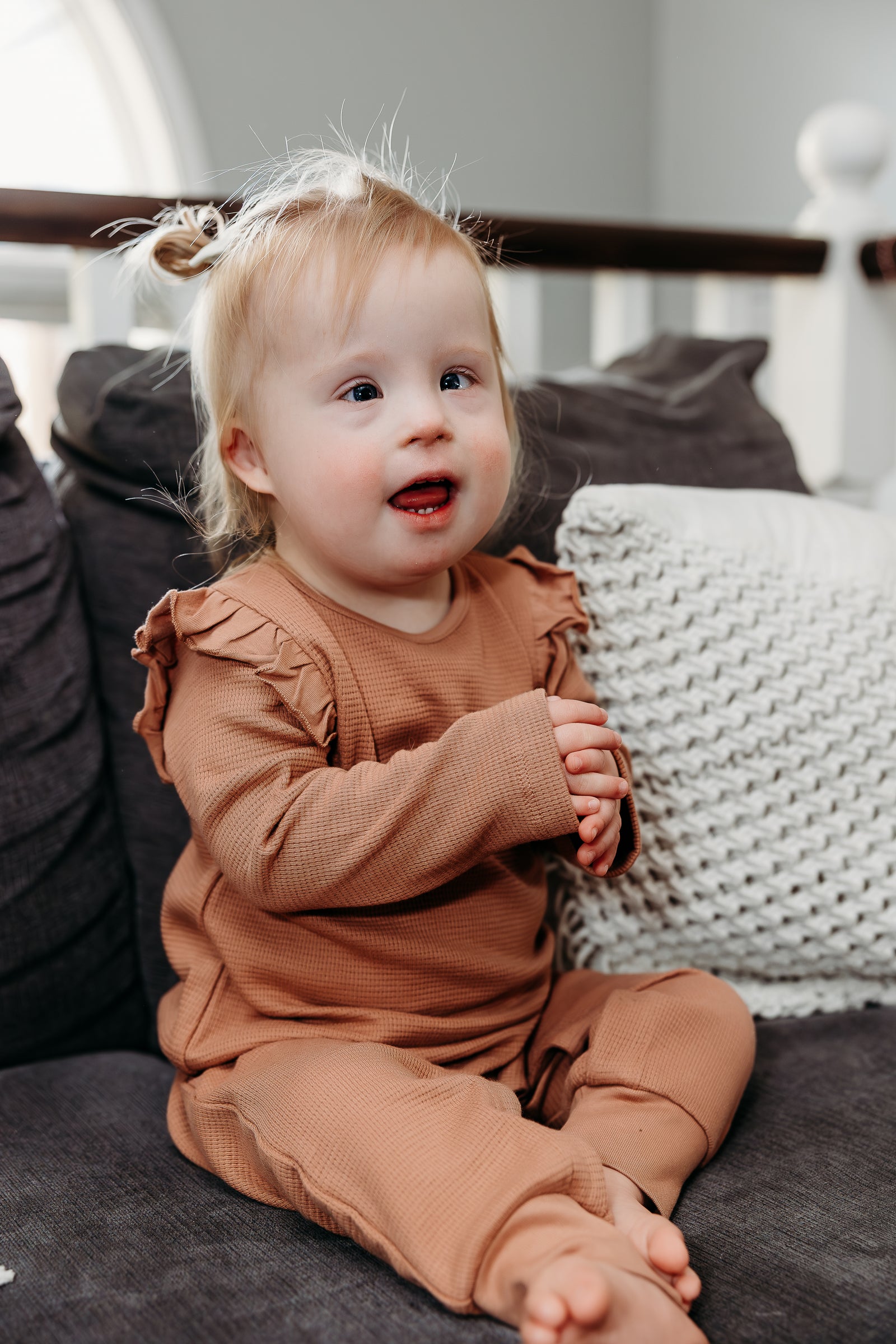 $45.00 CADWaffle flutter sleeve romper in Cedar